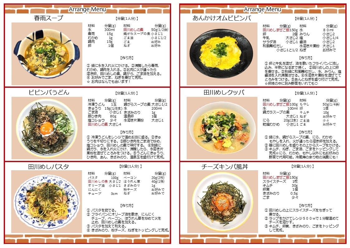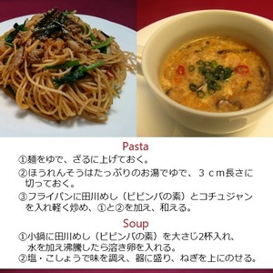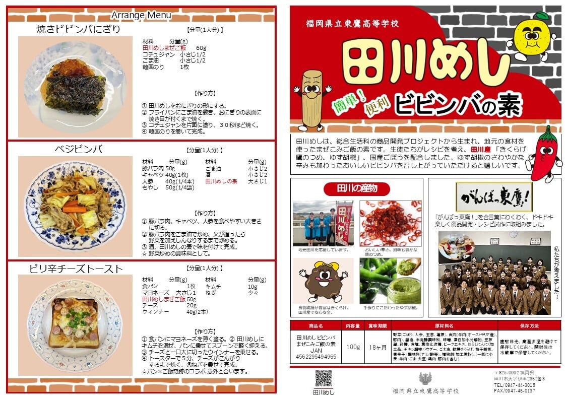 田川めしは、総合生活科の商品開発プロジェクトから生まれ、地元の食材を使ったまぜこみご飯の素です。生徒たちがレシピを考え、田川産 「きくらげ、鷹のつめ、ゆず胡椒」、国産ごぼうを配合しました。ゆず胡椒のさわやかな辛みも加わったおいしいビビンバを召し上がっていただけると嬉しいです。